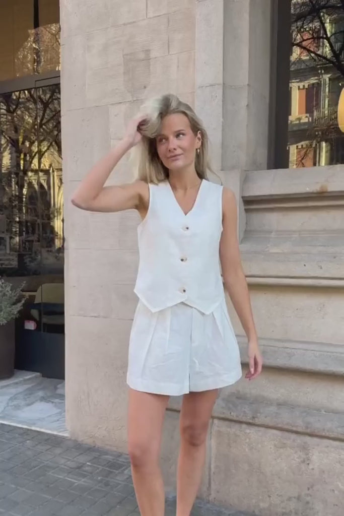 White, oversized shorts in a linen look with elastic band and a zipper, match it with Celina shirt og vest.