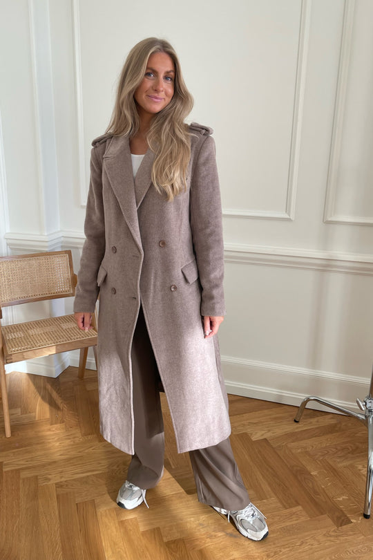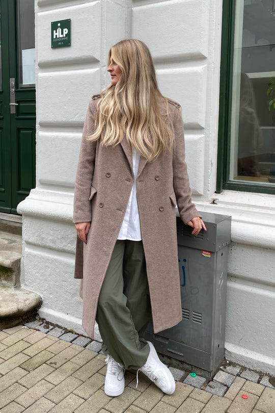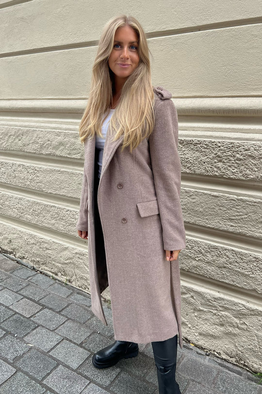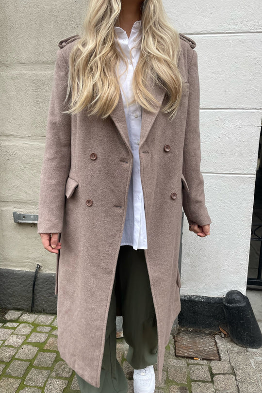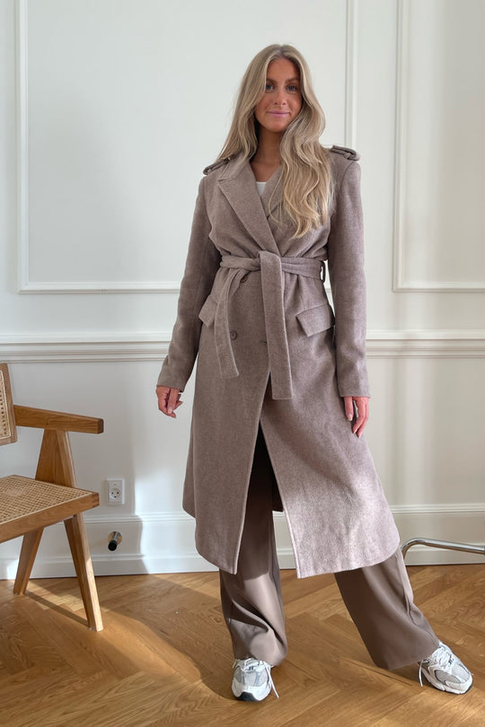 Comfy wool jacket for fall with buttons and waistband for closure.