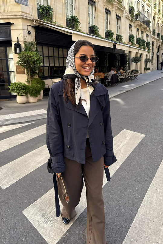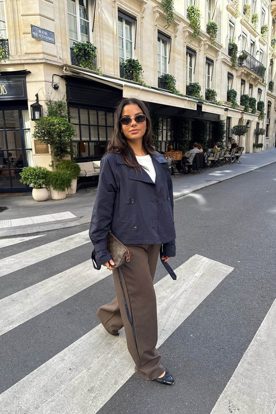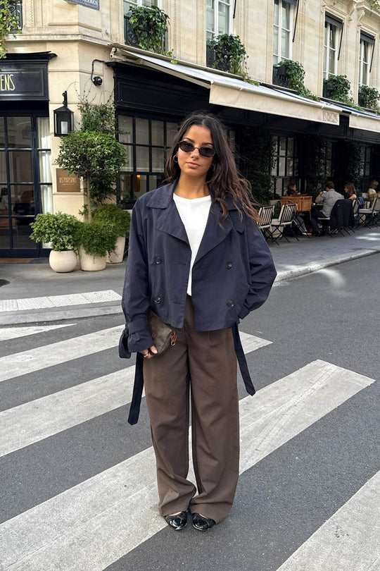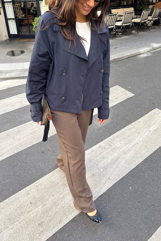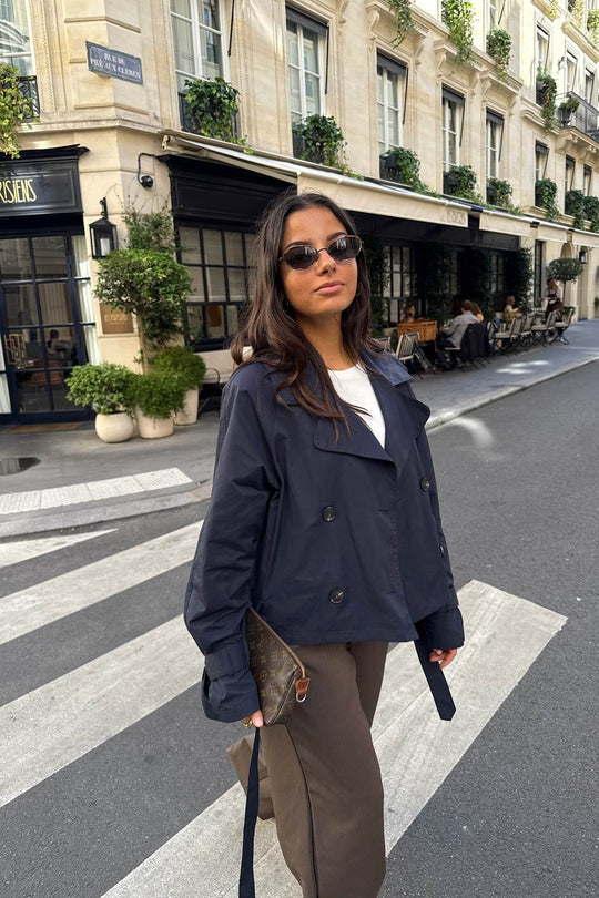 Short trenchcoat in navy with a loose fit. The trenchcoat has natural-colored buttons at the front for closure and strap details on the sleeves, which are also fastened with a button. The trenchcoat has a tie around the waist and pockets.