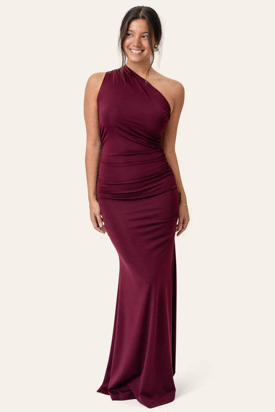 Beautiful one-shoulder maxi dress in bordeaux. The dress is made from a lovely soft and stretchy fabric, giving it an elegant, form-fitting look around the body, while the A-line shape at the bottom adds a more flowy look to it. It features ruffle details along the side and over the shoulder for a feminine touch.