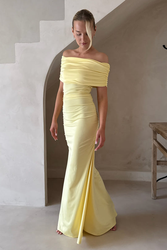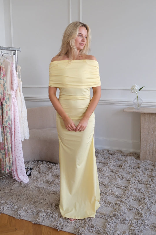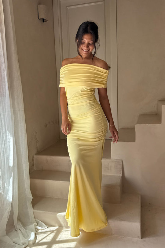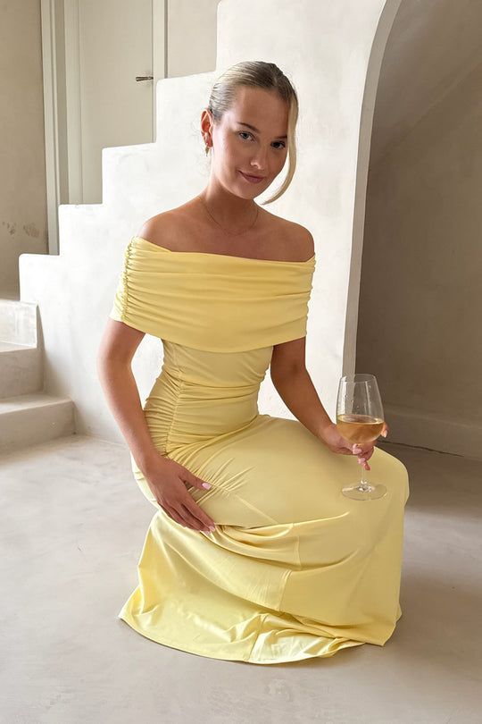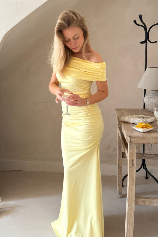 Beautiful off shoulder maxi dress in yellow. The dress is made from a lovely stretchy fabric, giving it an elegant, form-fitting look around the body, while the A-line shape at the bottom adds a more flowy look to it. It features ruffle details along the side and over the shoulder for a feminine touch.