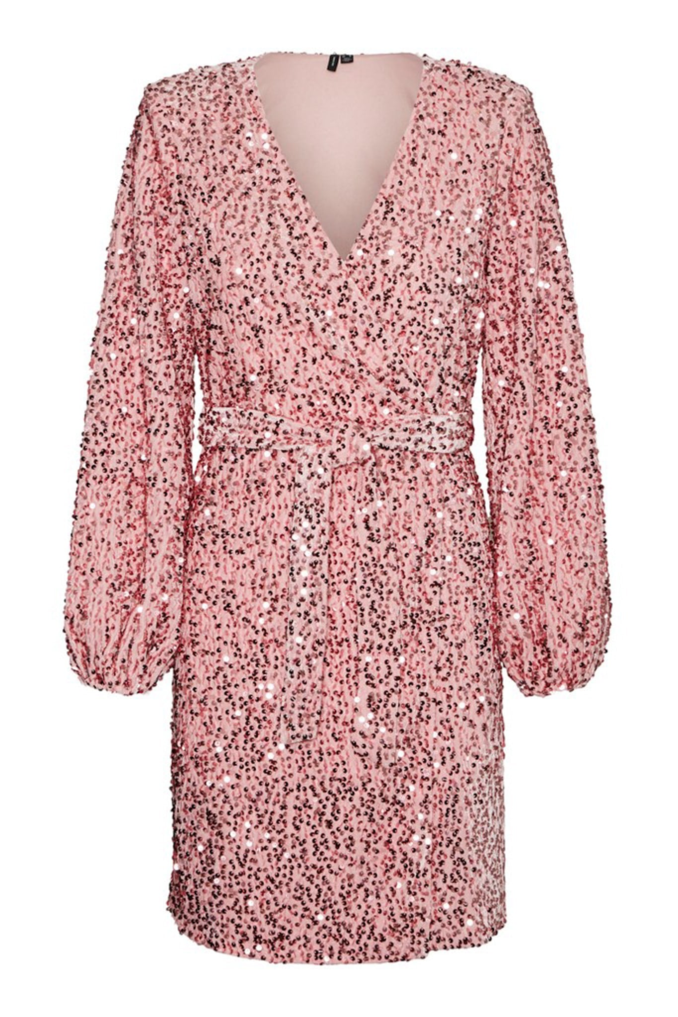 Pink dress with sequin, long puffy sleeves, v-neck and with a wrap effect, so you can make the look like a hourglass.