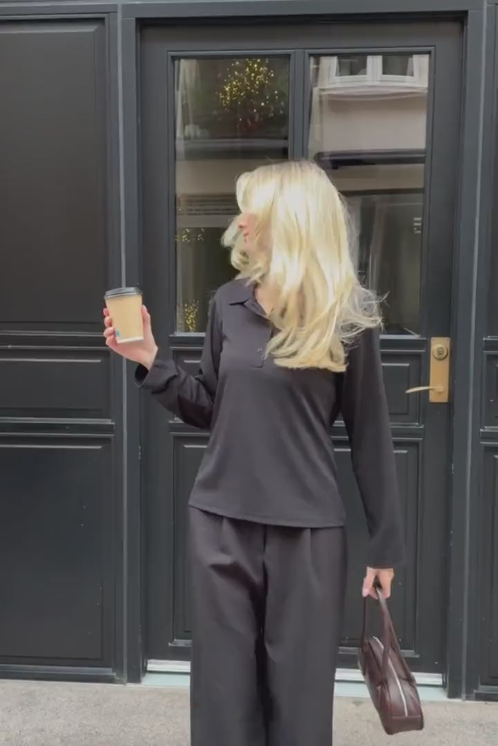Classic long-sleeved polo in black. Crafted from a soft, ribbed fabric with plenty of stretch, this blouse offers a comfortable and flattering fit. It features an elegant collar and a half-button placket at the front, giving it a relaxed yet refined look.