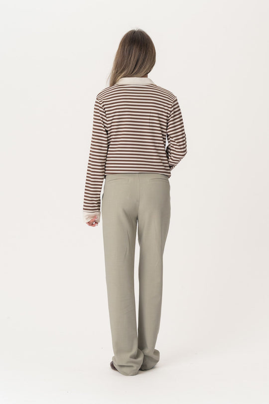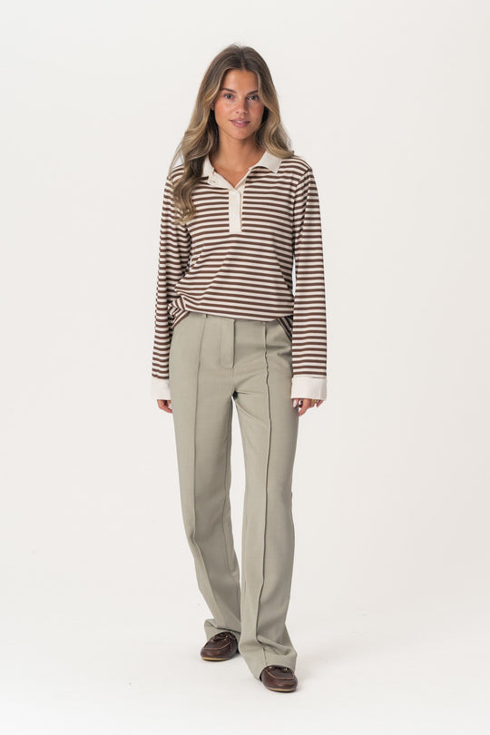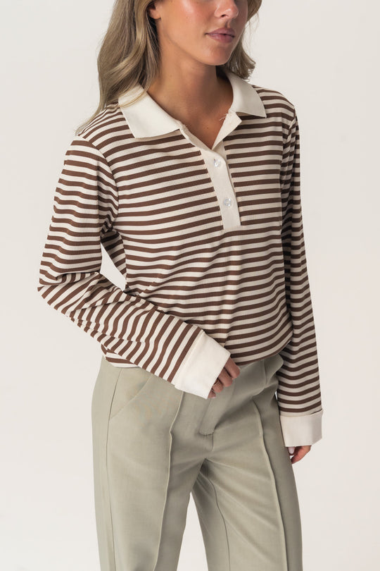 Lovely polo shirt featuring brown and white stripes. Designed with long, straight sleeves finished with a wide white cuff for a clean look. The shirt has a crisp white shirt collar and three buttons, allowing it to be worn fully buttoned to the neck or open in a V-shape over the chest.