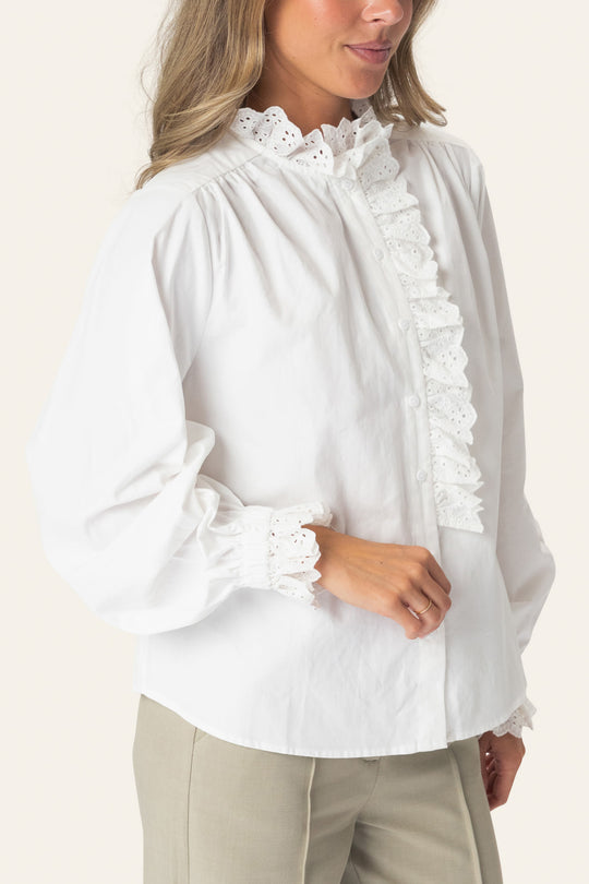 An elegant white shirt with a loose fit around the body for a relaxed yet refined look. It features long sleeves with elasticated cuffs that create a softly puffed silhouette, finished with delicate ruffle details. The shirt has a round neckline and a full button-down front closure. A ruffled trim frames both the neckline and the button placket, adding a romantic and feminine touch.