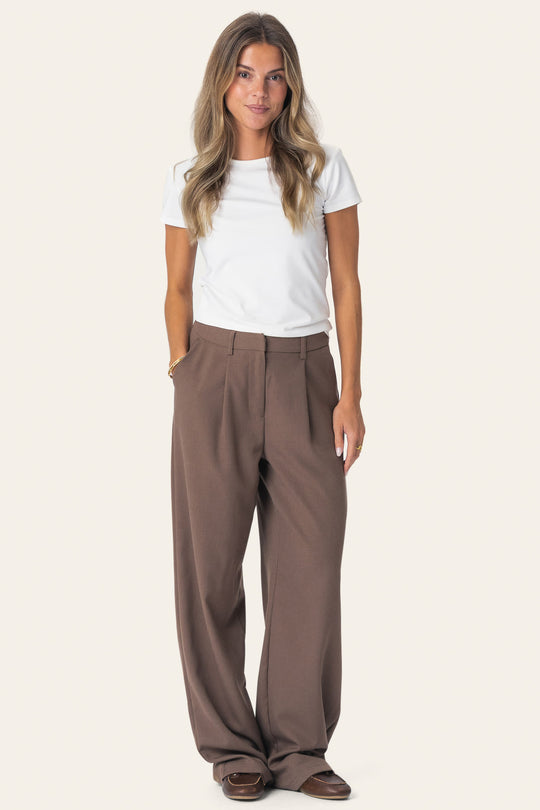 Classic wide-leg trousers in a brown shade, crafted from a soft, lightweight fabric with a subtle textured finish. Designed with front pleats offering a timeless and flattering silhouette. Featuring side pockets, belt loops, two faux pockets at the back, and a discreet front zip-and-hook closure. The relaxed fit and elegant drape make them perfect for both office wear and casual everyday outfits. Style with a shirt and blazer for a polished look, or with a knit and sandals for effortless elegance.