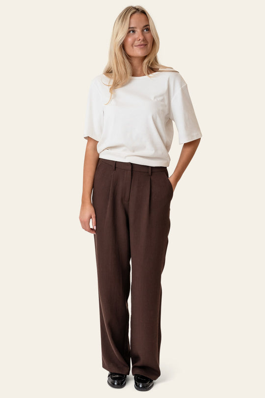 A pair of elegant, loose-fitting trousers in a soft, lightly textured fabric with a beautiful, heavy drape. The trousers feature a classic, timeless silhouette with a high waist and pressed creases that add a refined touch. The dark brown fabric gives an exclusive look with a textured finish, making them suitable for both everyday wear and more formal occasions. The design is detailed with belt loops, slanted side pockets, and welt pockets at the back. The relaxed fit combined with the soft material ensures a flattering and comfortable feel. Style them with the matching blazer or a light knit for a modern, sophisticated look.