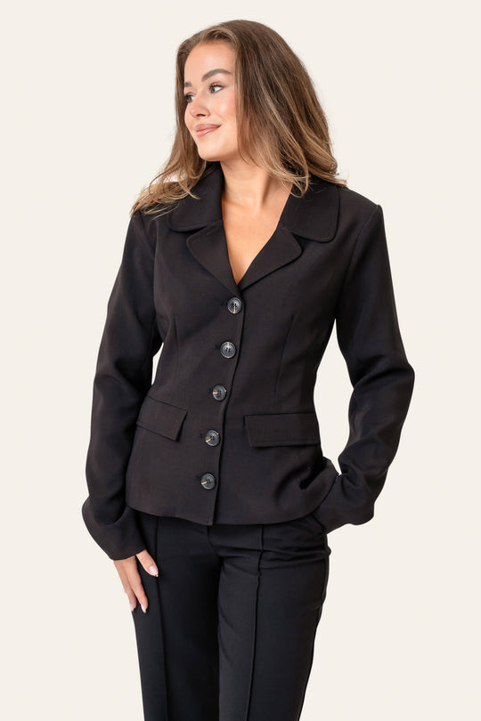 An elegant, fitted blazer in black. The jacket is designed with a defined waist that accentuates a feminine silhouette and creates a sophisticated, tailored look. It features a classic collar, decorative stitching, and front closure with eye-catching natural-toned buttons that add an exclusive touch. At the front, the blazer has two flap pockets and a gently rounded hem, striking the perfect balance between classic and modern style. The soft, structured fabric makes it comfortable to wear while maintaining its beautiful shape. Style it with the matching SignatureIC trousers for a complete, timeless set – perfect for the office, dinner, or events where you want a polished and feminine look.