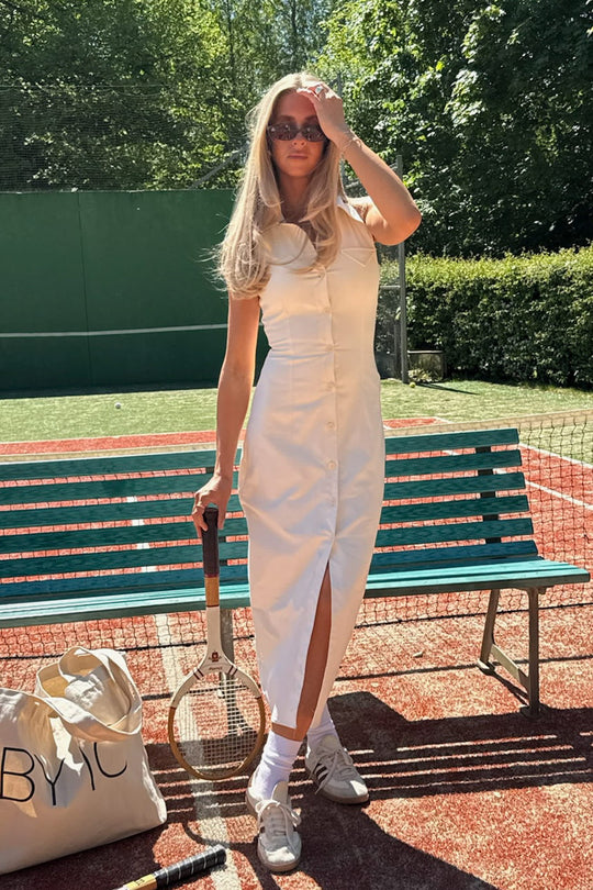 Beautiful midi dress in white. The dress is form-fitting and made from a heavy fabric. It features short sleeves and a shirt collar for an elegant finish. Additionally, it has buttons running halfway down the front, creating a slit at the bottom for a refined touch.