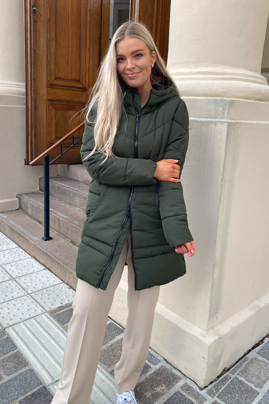 Comfy long jacket with hoodie, pockets and zipper closure.