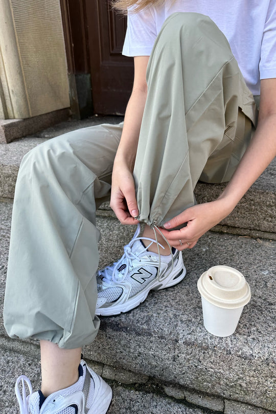 Cargo pants with adjustable elastics band around the waist and ankles.