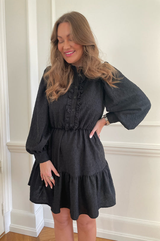 Beautiful black dress with structure in the material and a cute ruffle detail in the front.