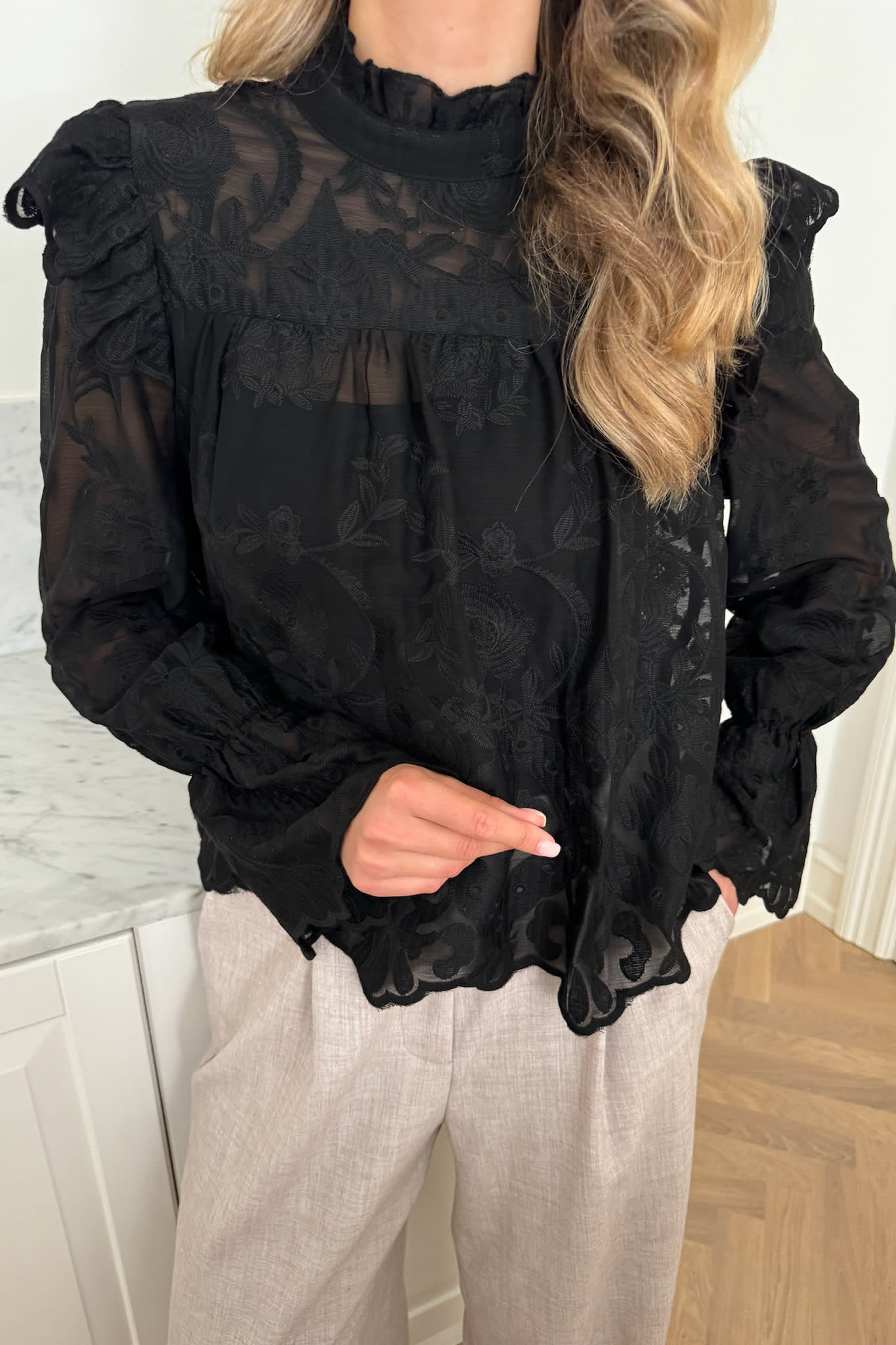 An elegant black lace shirt with a relaxed fit and refined frill details. The sleeves are finished with ruffled edges and an elastic cuff, giving them a softly puffed look. Delicate frills also decorate the shoulders and the high collar, adding a sophisticated and feminine touch. The shirt fastens at the back of the neck with a small button.