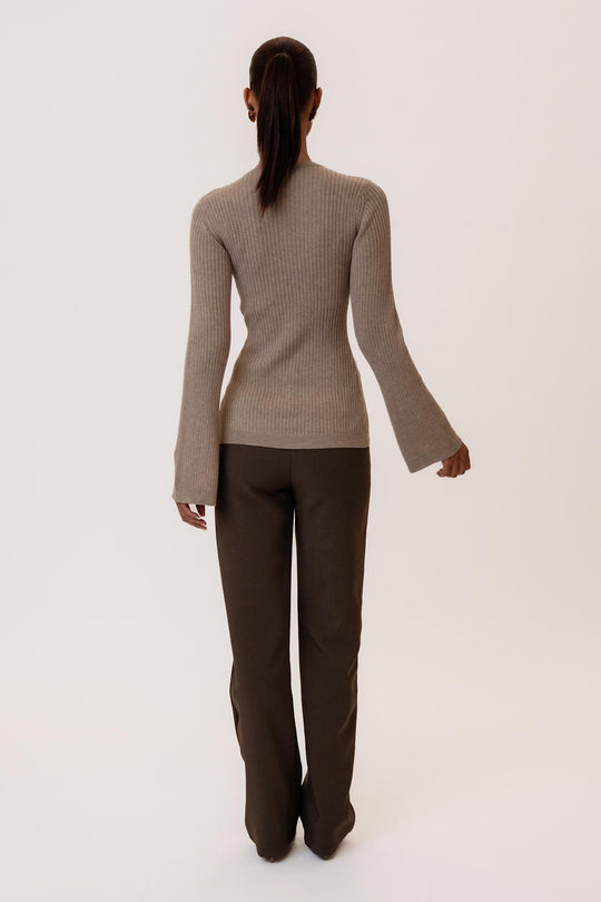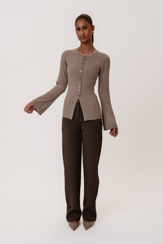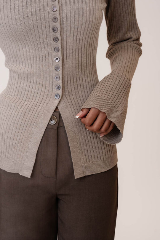 A beautiful rib-knitted cardigan in a light brown shade, designed with a timeless and feminine expression. The cardigan features a slim, figure-hugging fit and is made from a soft, stretchy material that ensures both comfort and freedom of movement. The front is adorned with small, shiny buttons running all the way down, and a subtle slit at the hem adds an elegant, modern touch. The slightly flared sleeves create a gentle drape and a feminine look. Perfect for both everyday wear and more elegant occasions – style it with tailored trousers or a skirt for a classic, sophisticated outfit.