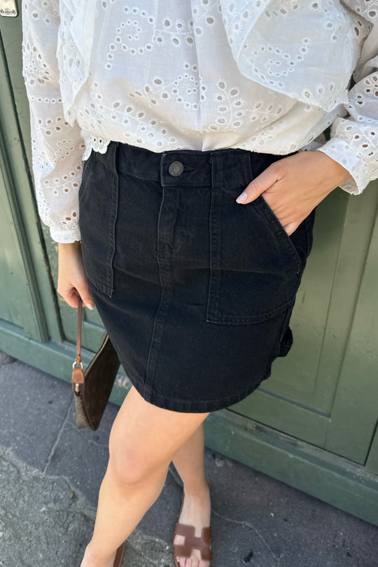 Black denim skirt with cargo details, zipper as closure, pockets on the front and back.