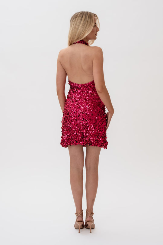 Fitted halterneck dress in pink sequin with a low back and buttons as closure in the back of the neck. It is stretchy and has a lining.