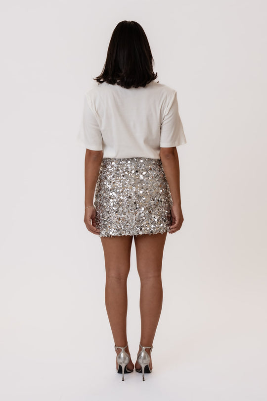 A sparkling mini skirt covered in large silver sequins that catch the light and create a glamorous look. The skirt features a fitted silhouette that accentuates the figure and gives an elegant, festive appearance. The short length and shimmering material make it perfect for special occasions where you want to stand out. It’s lined with a soft fabric for comfort, while the zip closure at the back ensures a smooth and seamless finish. Style it with a simple top and heels for a sophisticated party look – or pair it with a knit for a modern contrast between glamour and casual chic.