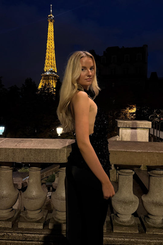 Fitted halterneck top with a low back and buttons as closure in the back of the neck. It is stretchy and has a lining.