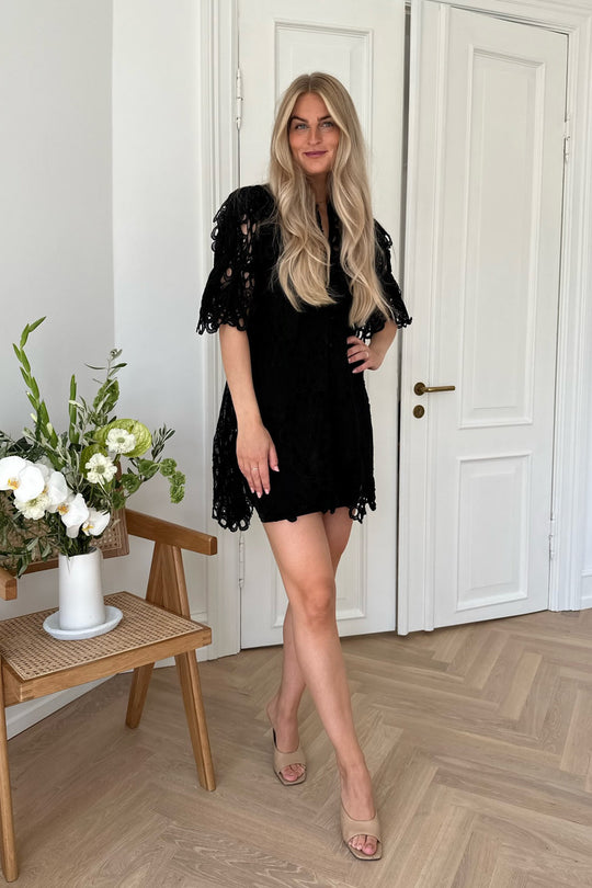 Beautiful lace dress with frills on the shoulders and small buttons down the front.
