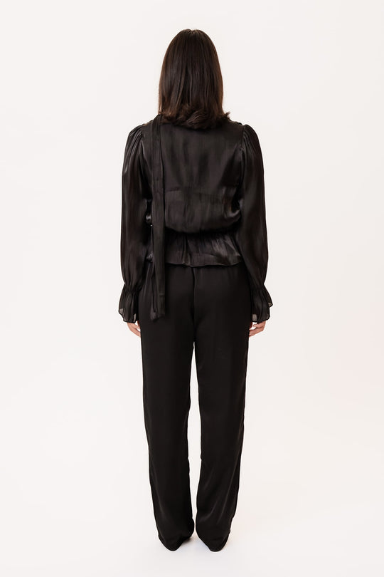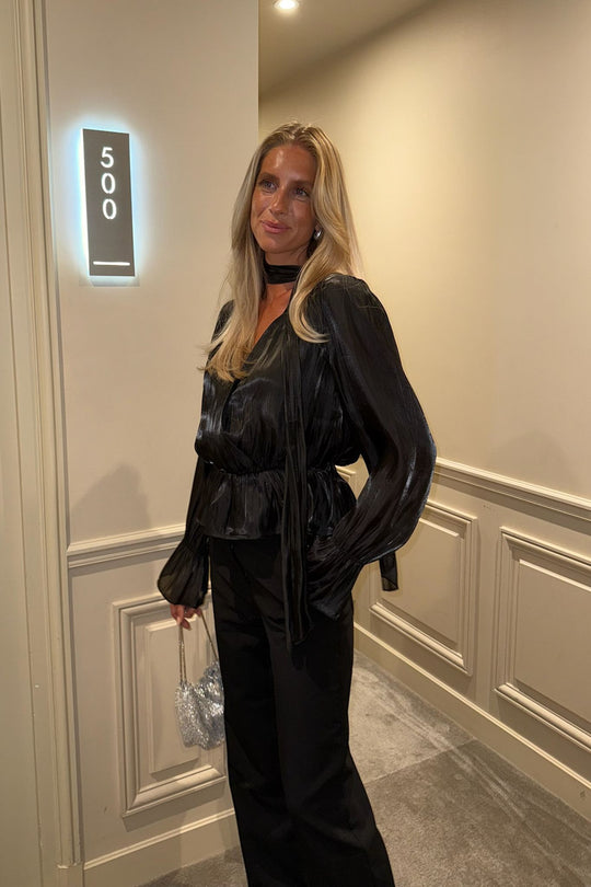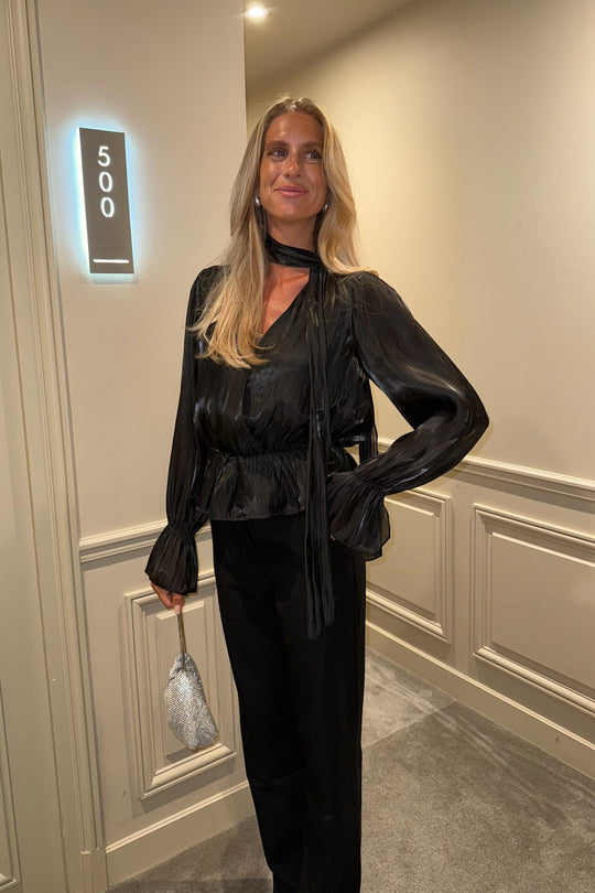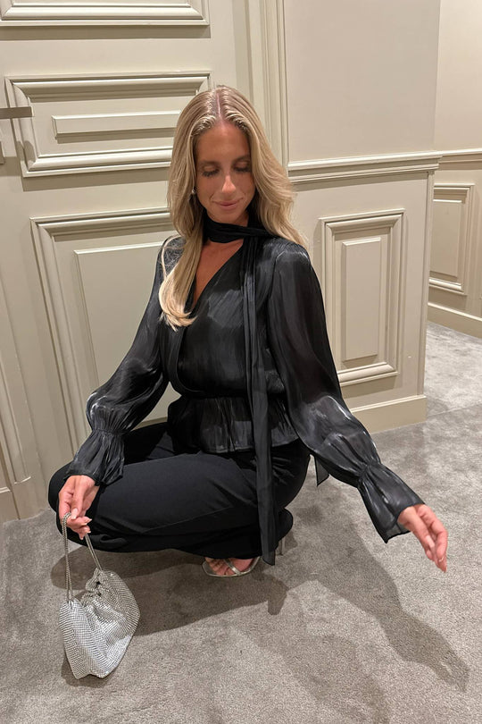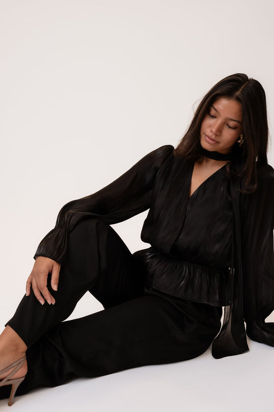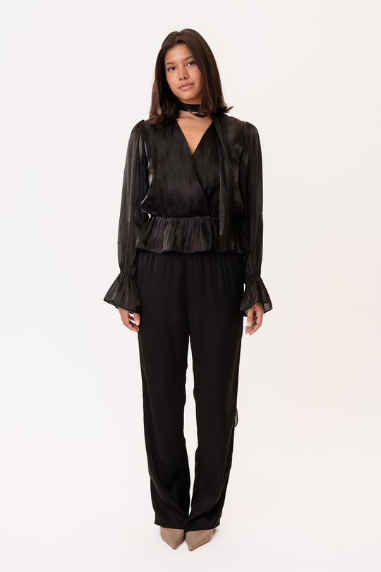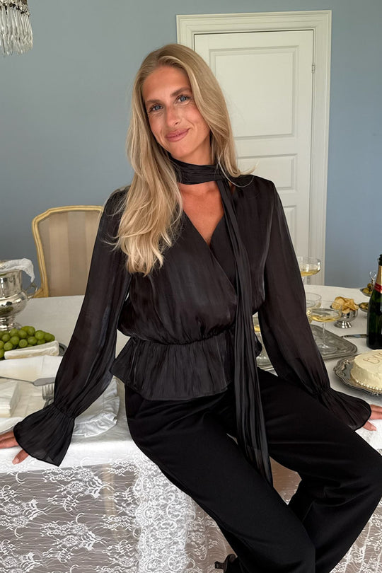 A stunning blouse in a soft black shade. The blouse has a relaxed fit with a defined waist, long sleeves, and a deep V-neckline with a wrap detail and delicate ruffles. The long sleeves are finished with elasticated cuffs, creating a subtle ruffle and giving the sleeves a softly puffed silhouette. The blouse comes with a tie belt, which can be worn at the waist or styled as a neck accessory for an extra touch.