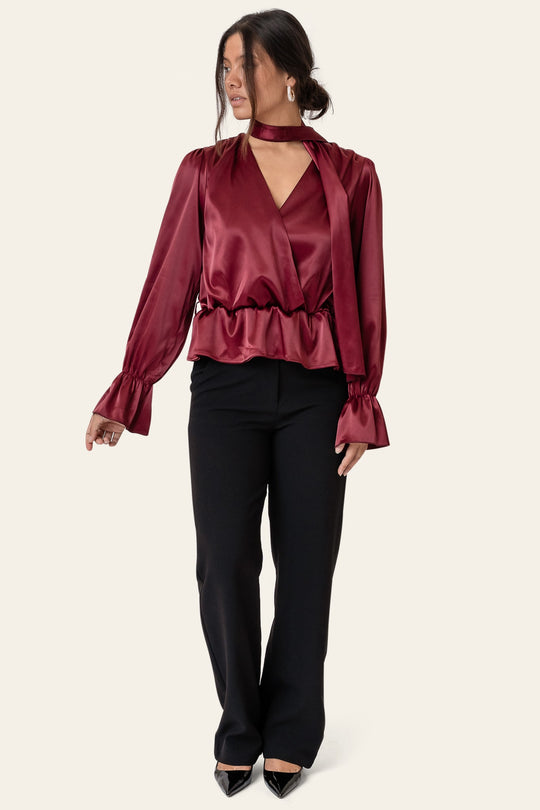 A stunning blouse in bordeaux satin. The blouse has a relaxed fit with a defined waist, long sleeves, and a deep V-neckline with a wrap detail and delicate ruffles. The long sleeves are finished with elasticated cuffs, creating a subtle ruffle and giving the sleeves a softly puffed silhouette. The blouse comes with a tie belt, which can be worn at the waist or styled as a neck accessory for an extra touch.