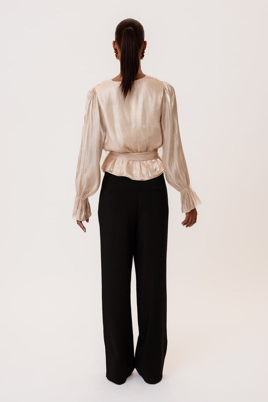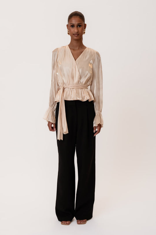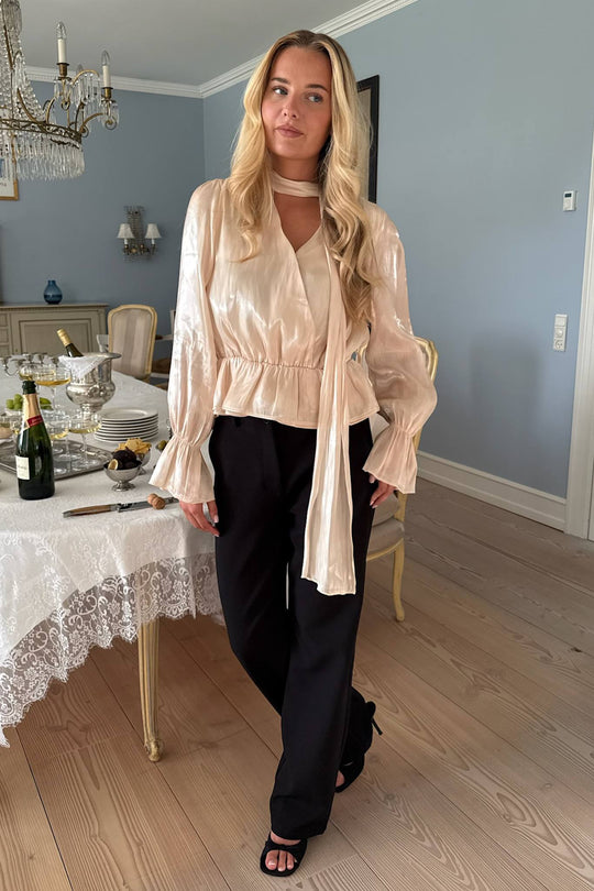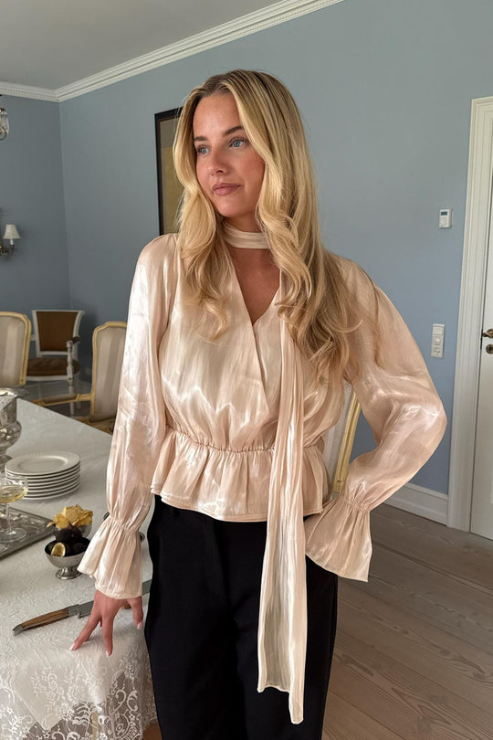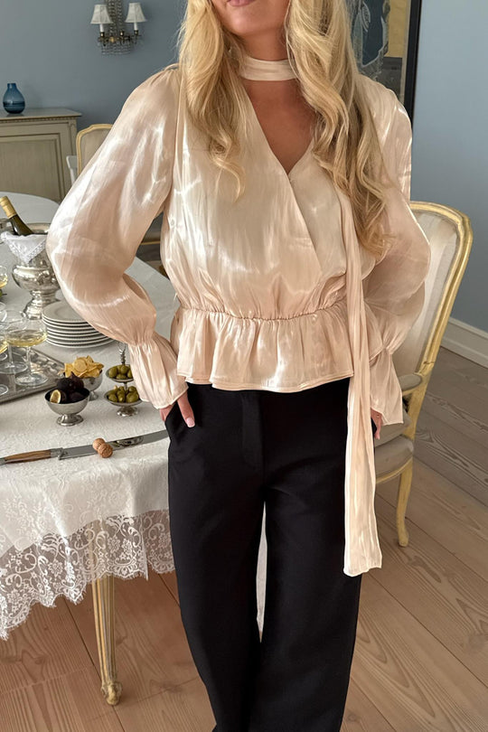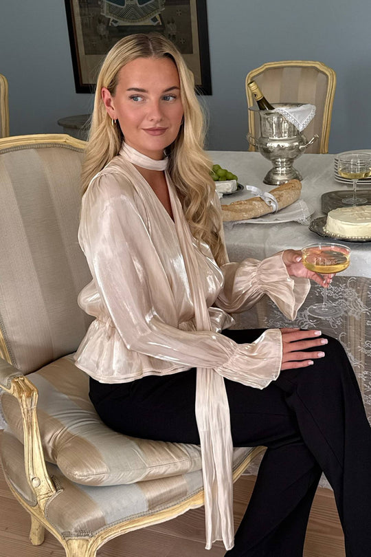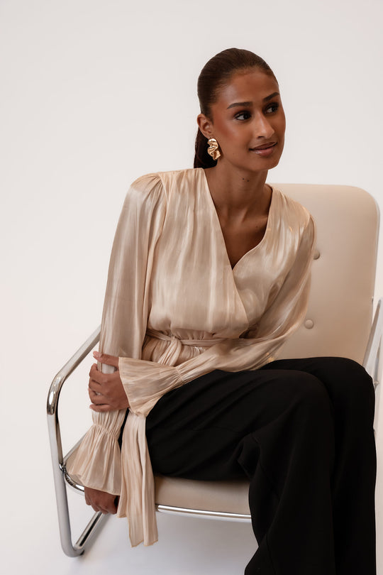 A stunning blouse in a soft champagne shade. The blouse has a relaxed fit with a defined waist, long sleeves, and a deep V-neckline with a wrap detail and delicate ruffles. The long sleeves are finished with elasticated cuffs, creating a subtle ruffle and giving the sleeves a softly puffed silhouette. The blouse comes with a tie belt, which can be worn at the waist or styled as a neck accessory for an extra touch.