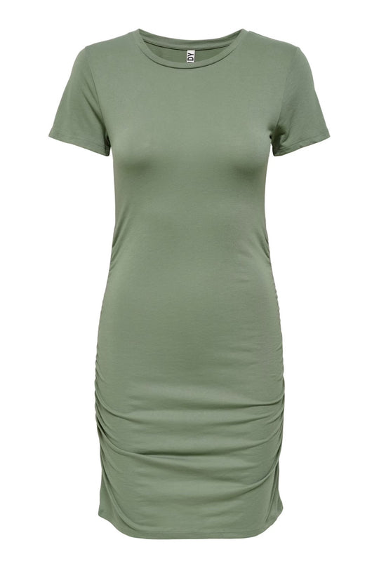 Close fitting dress in an olive green color with ruching details on the sides and short sleeves.