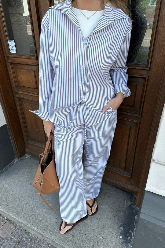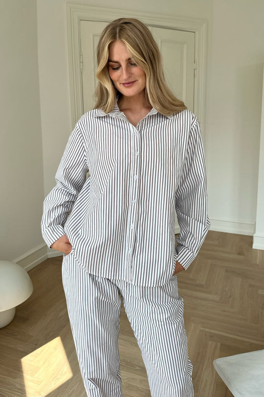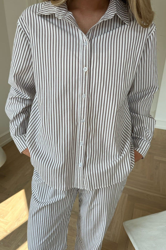 Striped brown and white shirt with buttons and a collar. Match it with our Hannah pants.