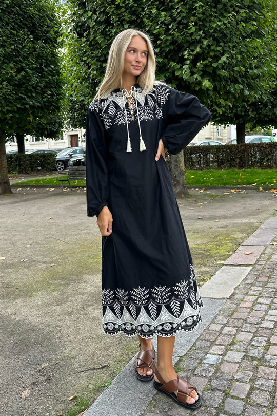 Bohemian inspired black long sleeved dress with embroidery details and a lace up in the neckline.