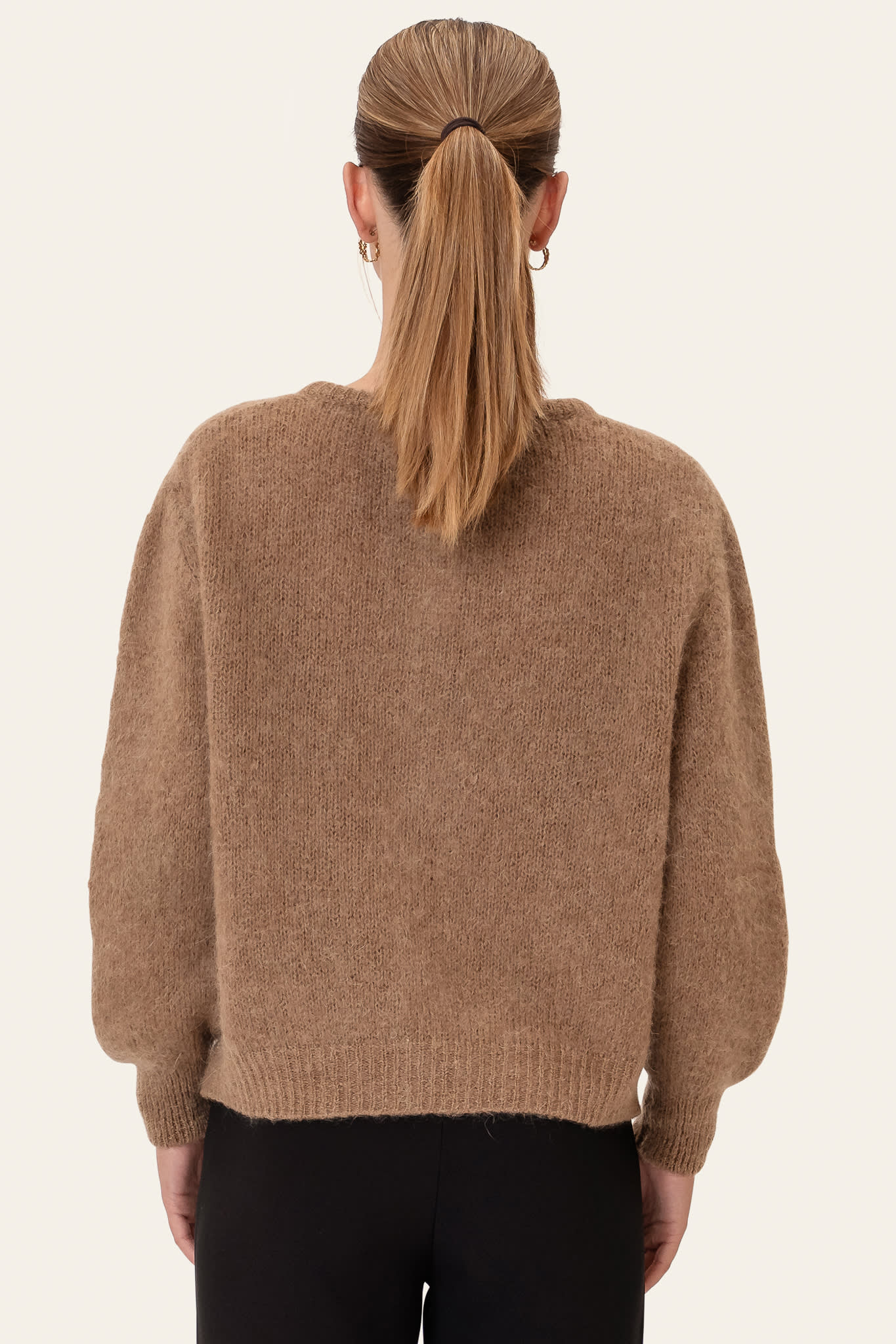 Fuzzy mohair cardigan with long voluminous sleeves, rib details and mother of pearl look on the buttons.