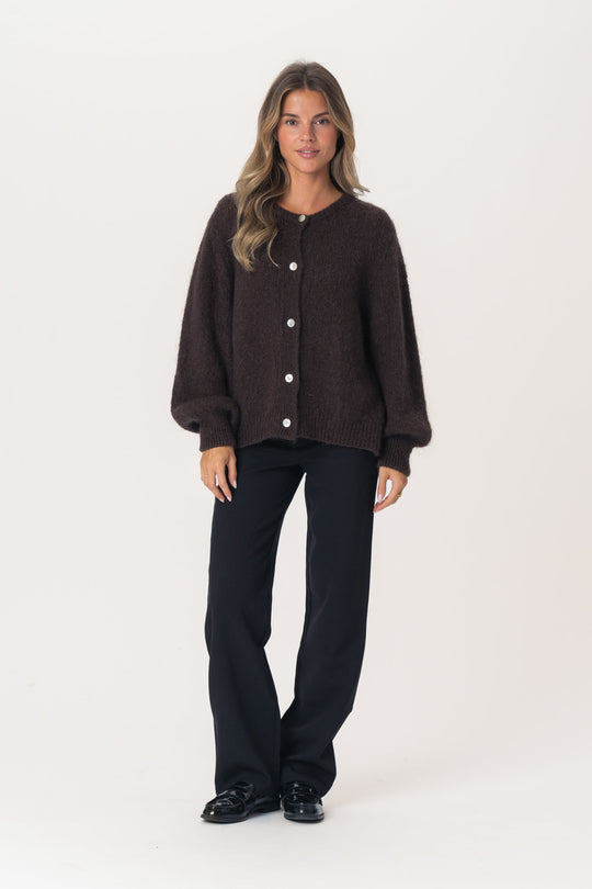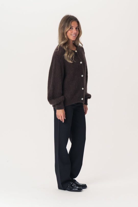 A beautiful fuzzy mohair cardigan in dark brown. The cardigan features long sleeves finished with wide, fitted ribbed cuffs that give the sleeves a softly puffed look. A matching wide ribbed trim is also found at the hem and around the round neckline, creating a voluminous silhouette when the cardigan is buttoned up. It closes down the front with elegant, pearl-like buttons for a refined touch.