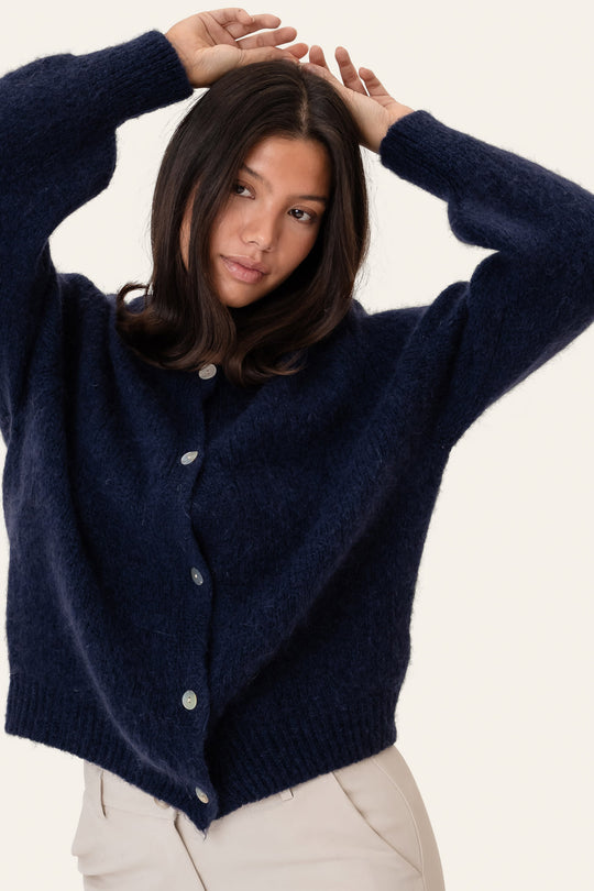 A beautiful fuzzy mohair cardigan in navy. The cardigan features long sleeves finished with wide, fitted ribbed cuffs that give the sleeves a softly puffed look. A matching wide ribbed trim is also found at the hem and around the round neckline, creating a voluminous silhouette when the cardigan is buttoned up. It closes down the front with elegant, pearl-like buttons for a refined touch.
