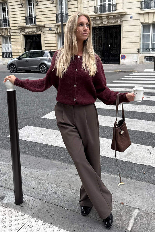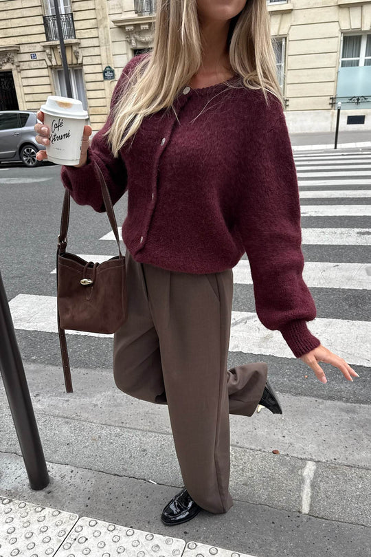 Fuzzy mohair cardigan with long voluminous sleeves, rib details and mother of pearl look on the buttons.
