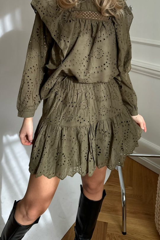 Cutest skirt with rubberband around the waist, embroidery- and ruffle details.