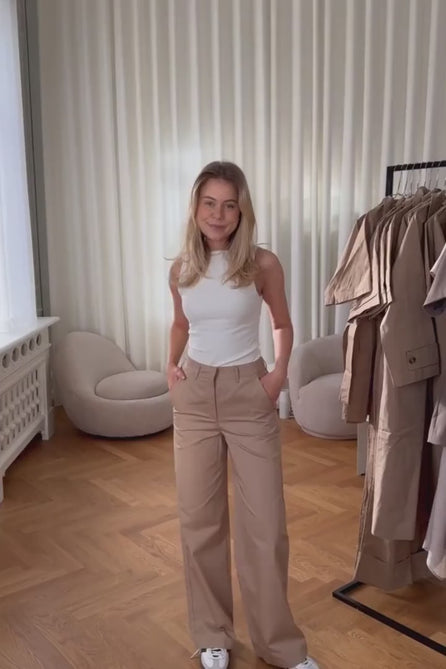 Loose tailored pants with elastic band on the back, pockets and a zipper as closure.
