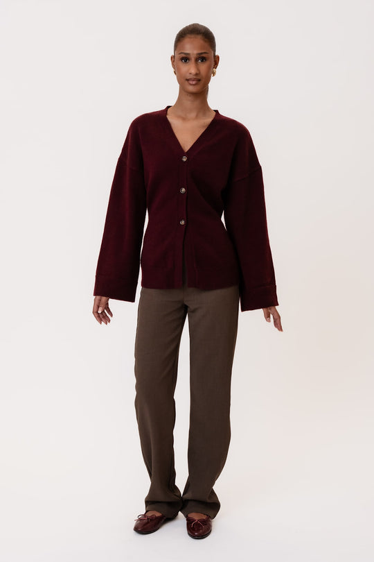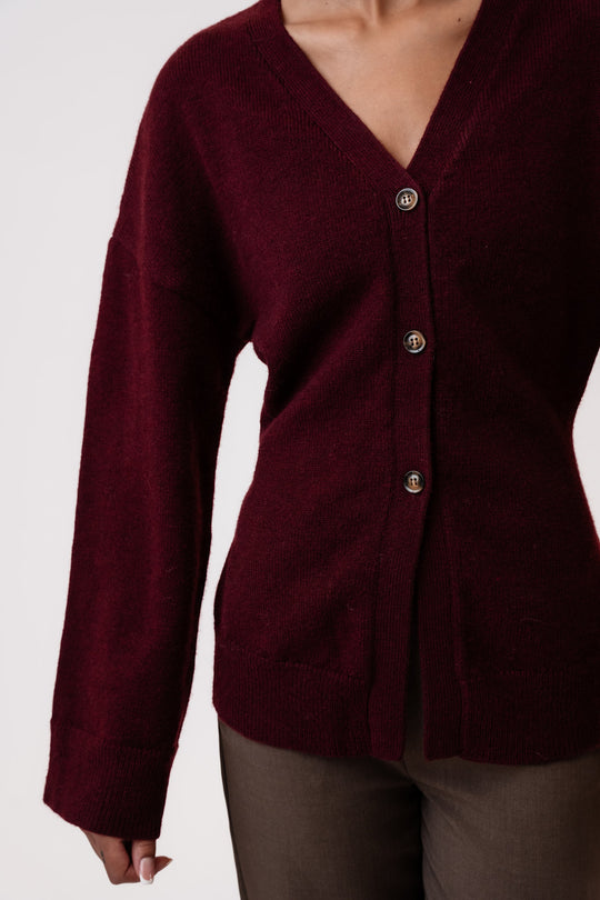 Soft tight fitted cardigan in woolblend with rib details. It has wide sleeves and 3 buttons as closure.