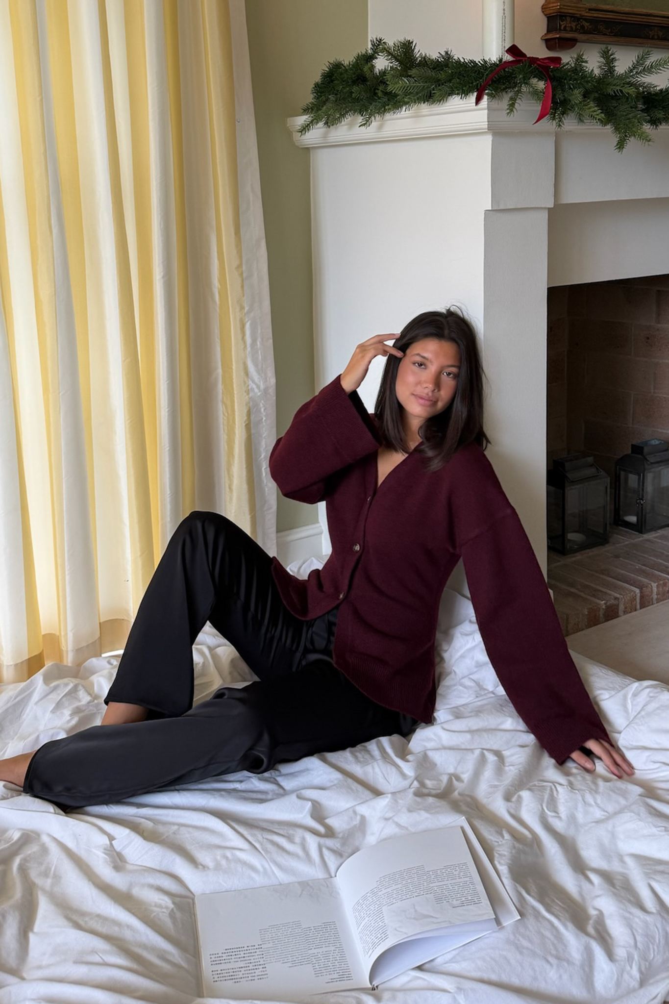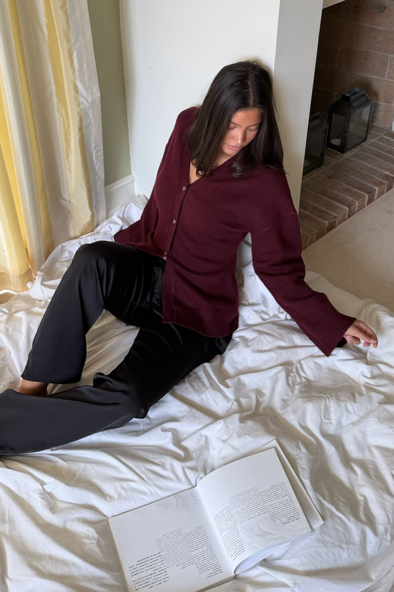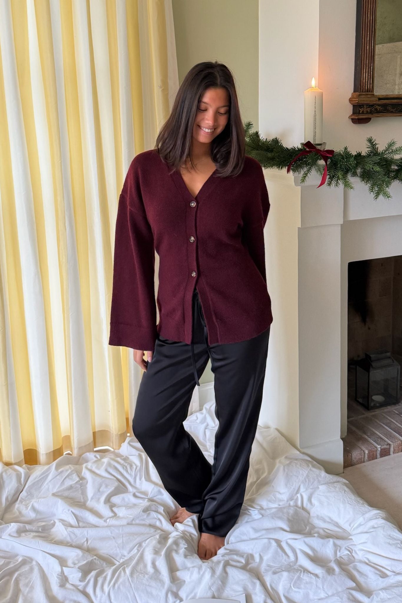 Elegant cardigan crafted from a soft and luxurious wool blend, offering both warmth and comfort. The design features a V-neckline, front button closure, and a relaxed fit with slightly dropped shoulders. The wide cuffs and ribbed edges add a refined touch, while the deep burgundy hue brings sophistication to any outfit. Perfect for layering – wear it over a shirt or dress, or pair it with the matching skirt for a coordinated look.