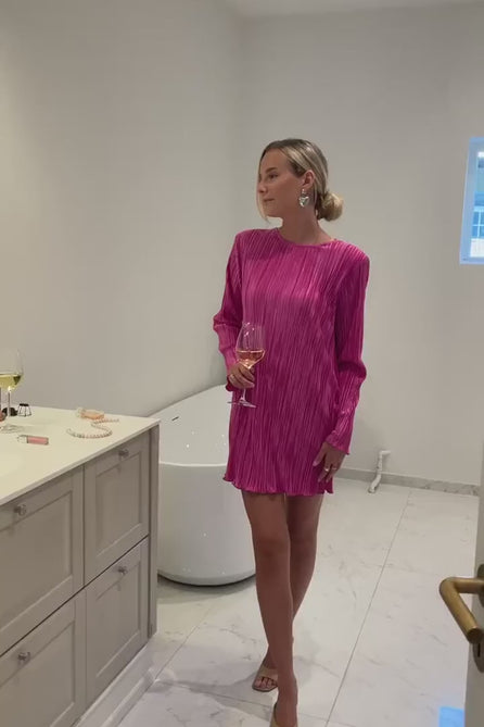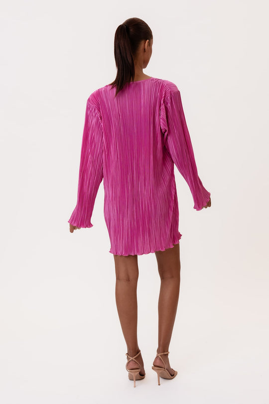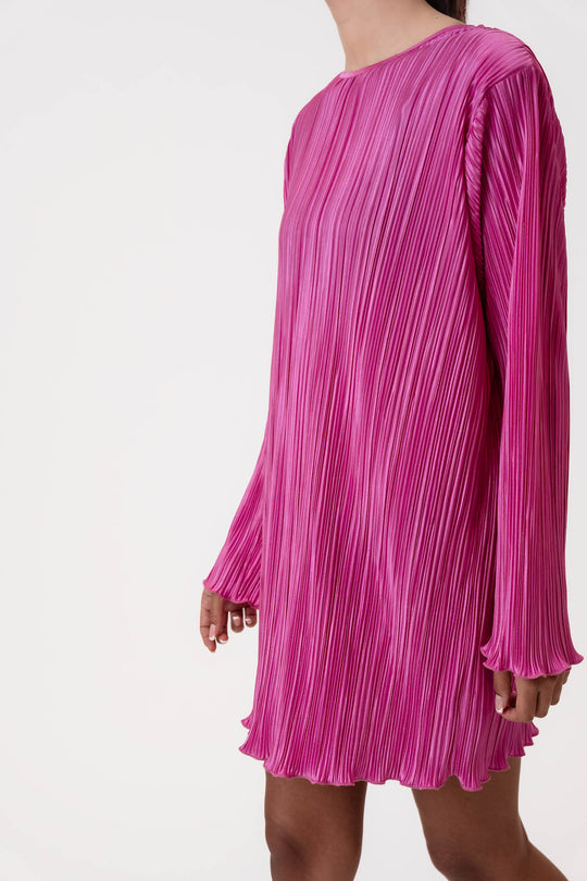 An elegant and eye-catching mini dress in a vibrant pink hue. Crafted from a lightweight pleated fabric with a subtle sheen, it drapes beautifully and moves gracefully with the body. The dress features long sleeves, a round neckline, and a relaxed fit for a modern, effortless silhouette. Finished with softly wavy hems at the sleeves and bottom for a feminine touch. Perfect for special occasions or as a bold, colorful statement piece in your wardrobe.