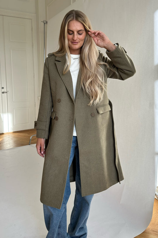 Wool jacket with details as pockets, sleeves and buttons on the shoulders. Closes with buttons and a tie.