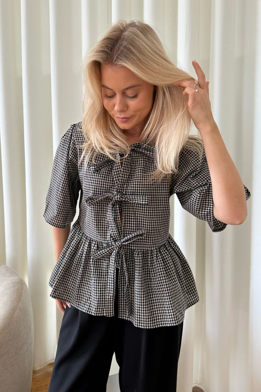 Checked tie top in black and beige with puffy sleeves. You can wear the top in 2 ways: with the ties on the front or in the back.