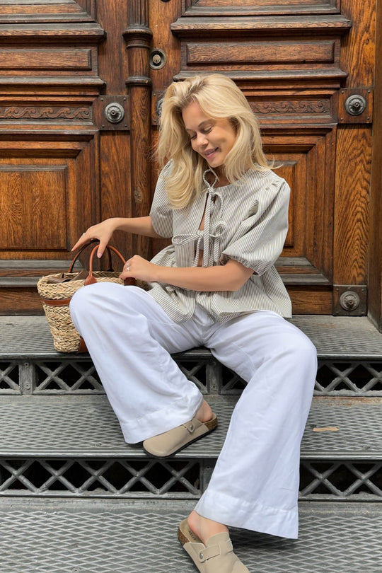 Striped tie top in beige with puffy sleeves in a strong quality. You can wear the top in 2 ways: with the ties on the front or in the back.