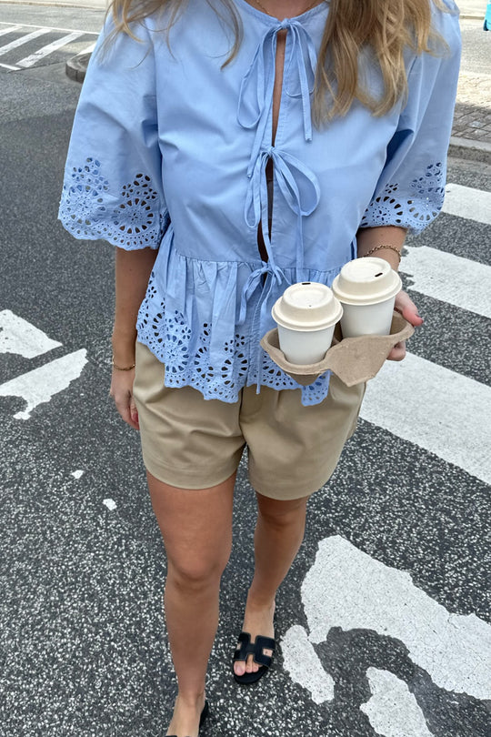 Embroidery, tie top in light blue with puffy sleeves. You can wear the top in 2 ways: with the ties on the front or in the back.