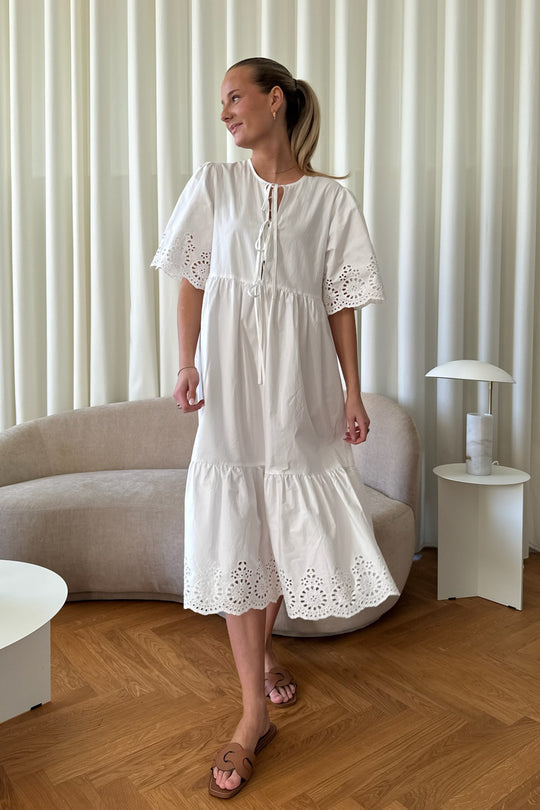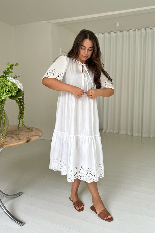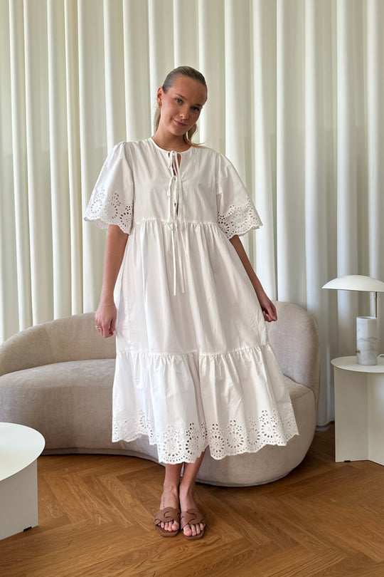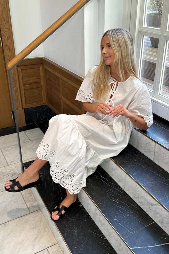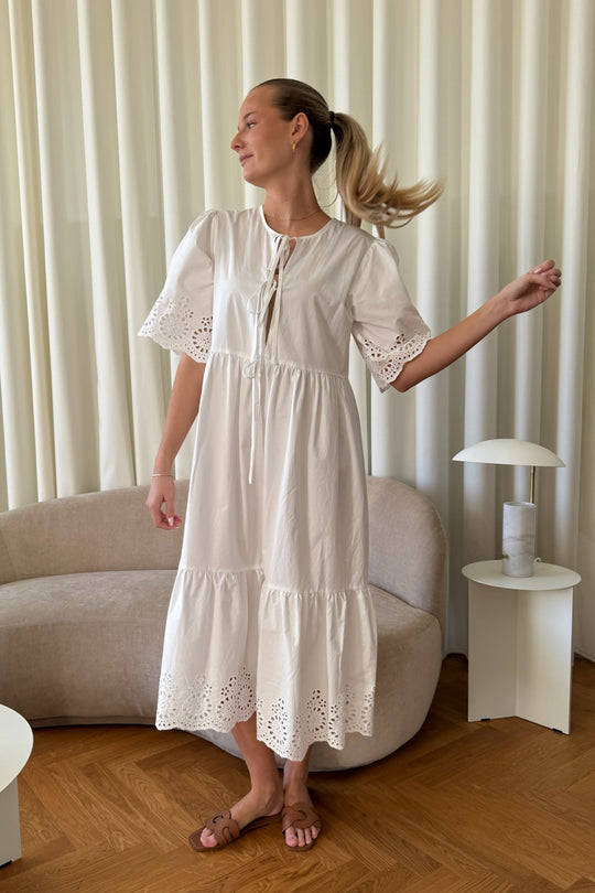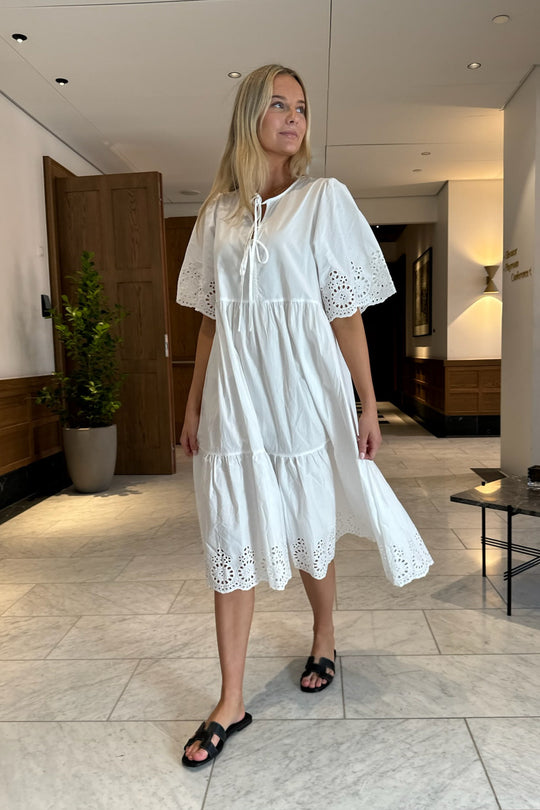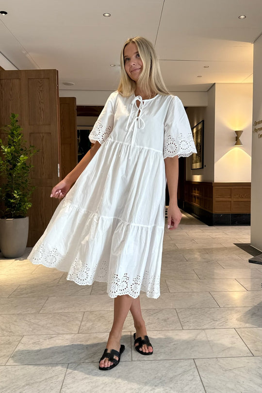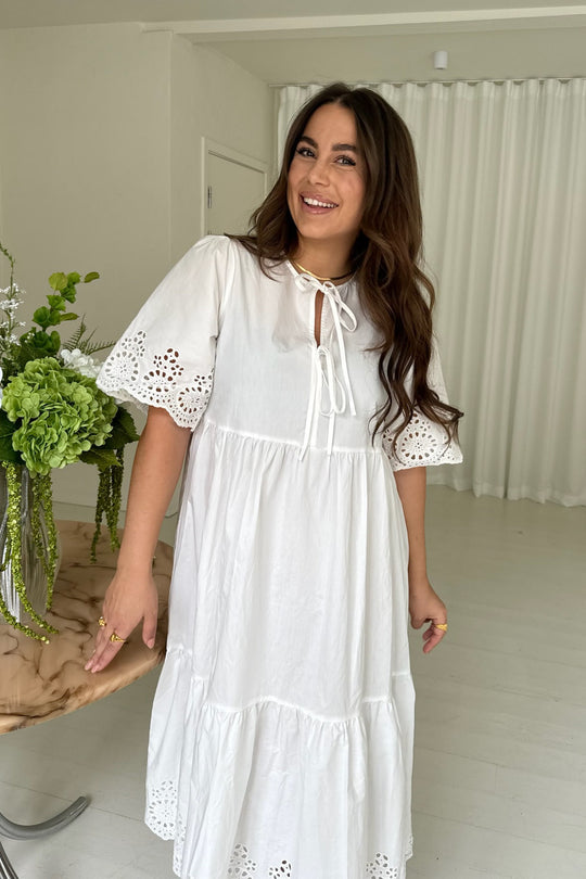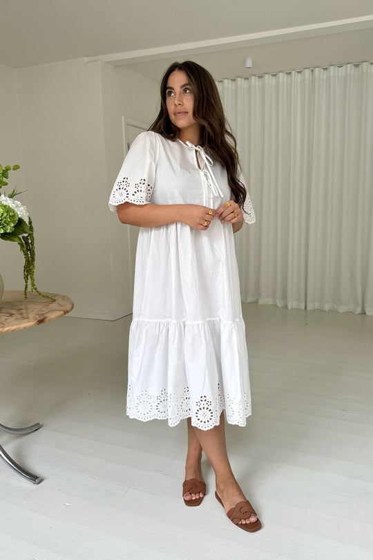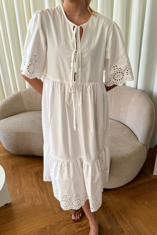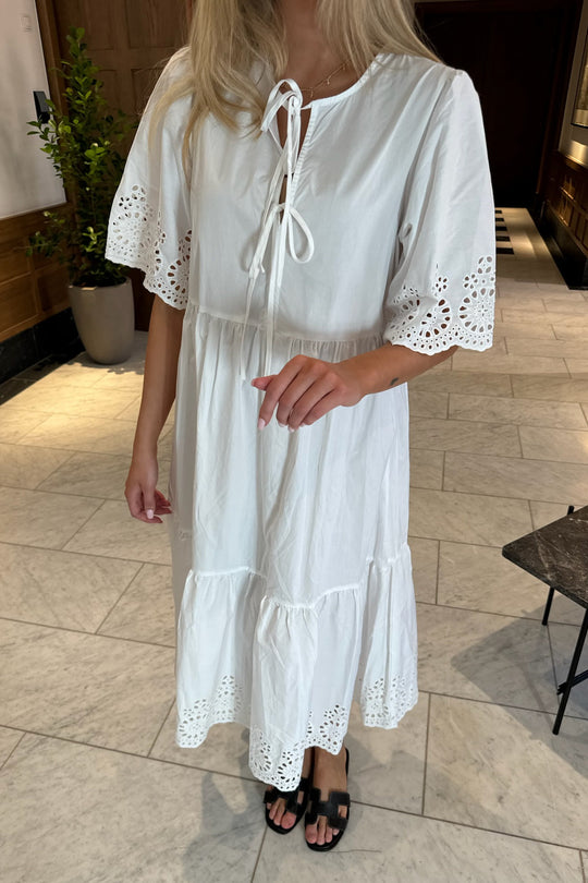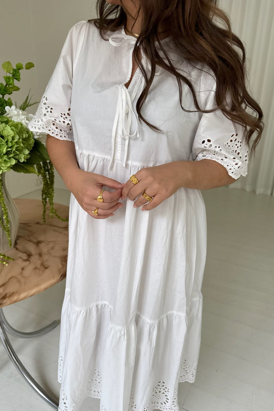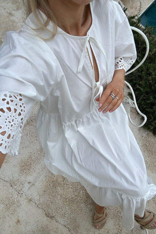 White dress with embroidery details on the sleeves and the bottom. You can have the two ties on the front or back. The dress has a loose fit.