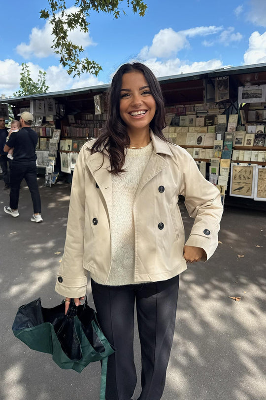 Elegant light beige short trenchcoat with a loose fit. The trenchcoat has natural-colored buttons at the front for closure and strap details on the sleeves, which are also fastened with a button. It has two pockets in the from and no tie.