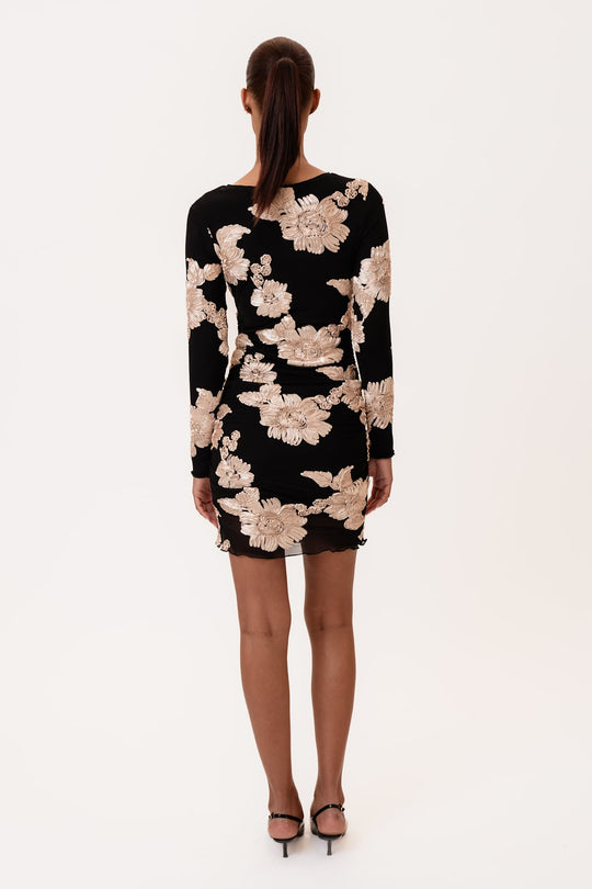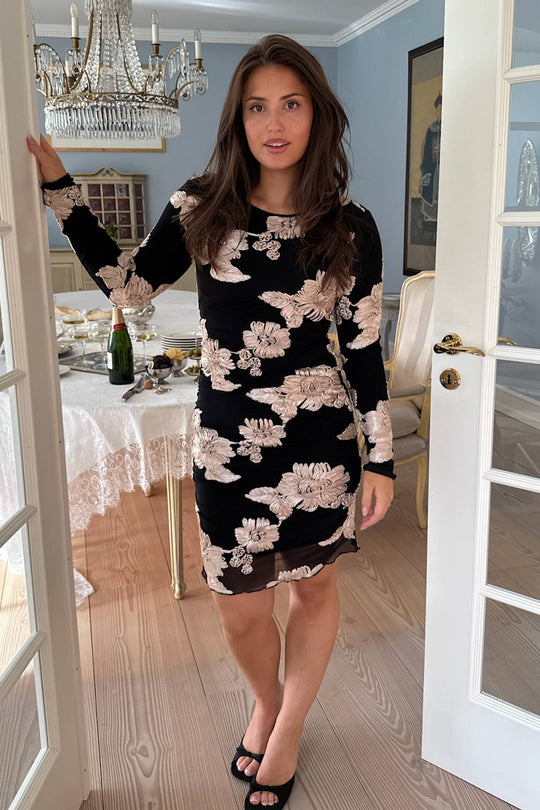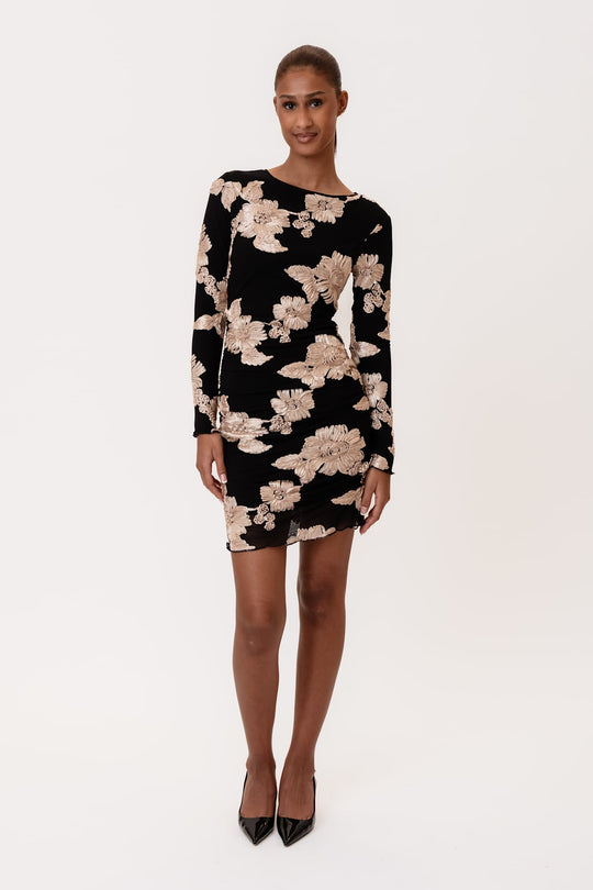 Short and tight-fitting mesh dress with 3D flowers and long sleeves.