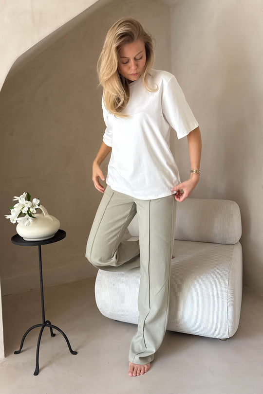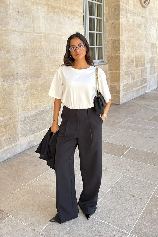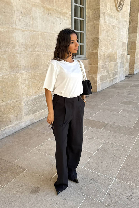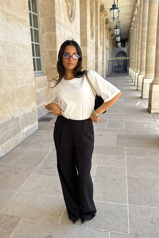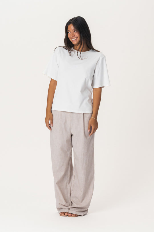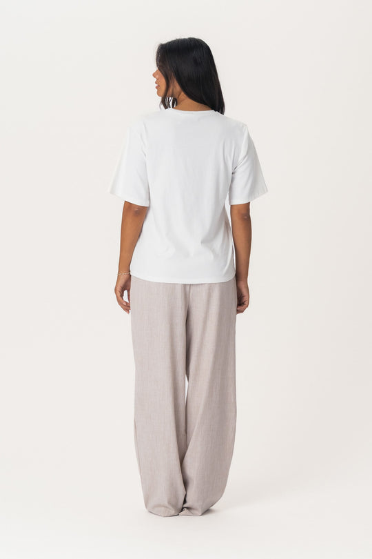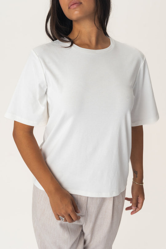 A basic white t-shirt featuring a loose fit, short sleeves, and a round neckline. The t-shirt includes shoulder pads to give it an added statement look.