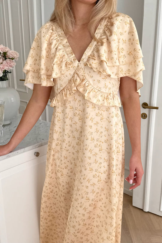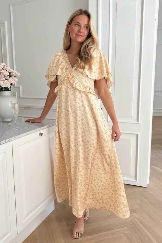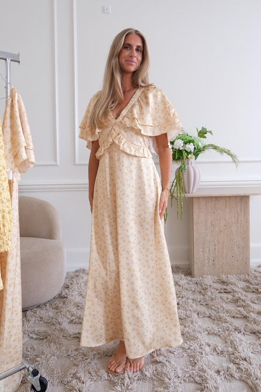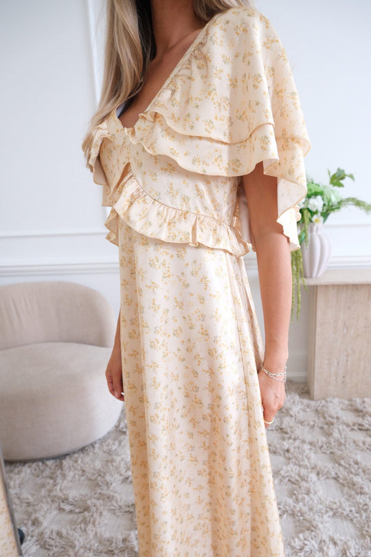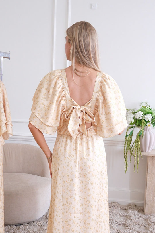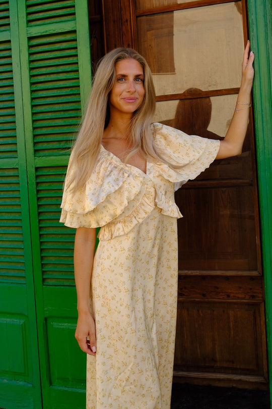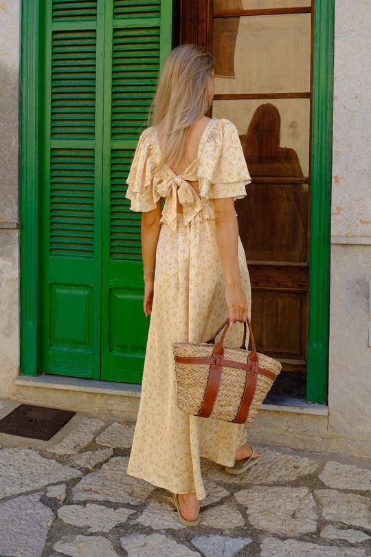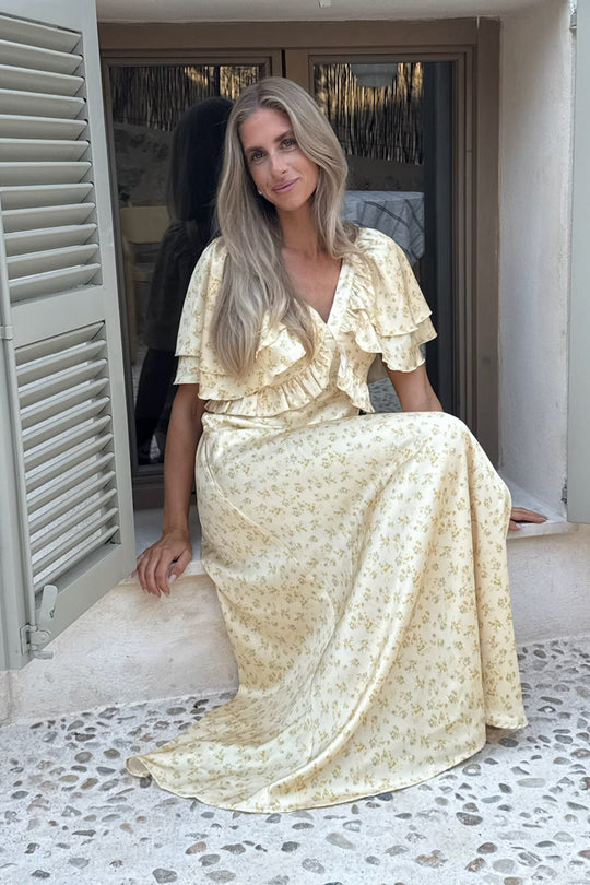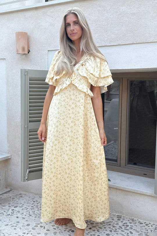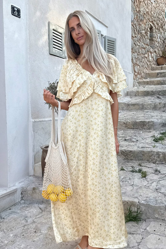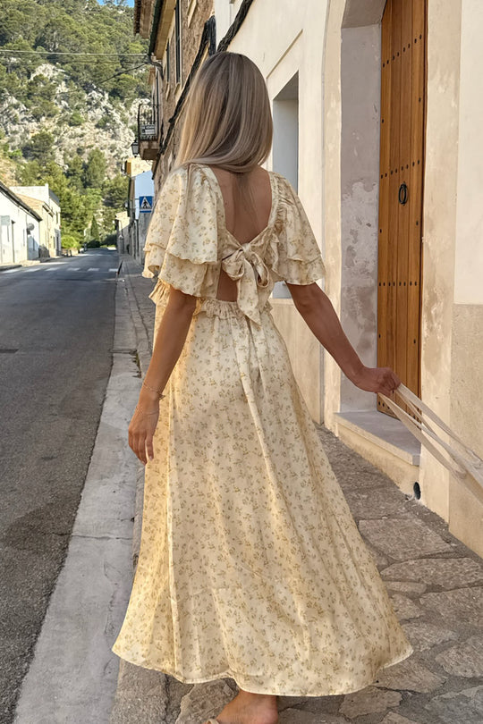 Beautiful long dress in yellow floral print. The dress features a V-neckline and short sleeves with ruffle details that extend across the chest and around the waist. It has a deep open back, elegantly tied with a bow. The dress is form-fitting around the bust with a loose skirt for a graceful look.