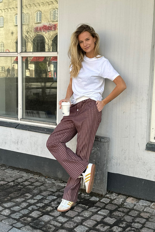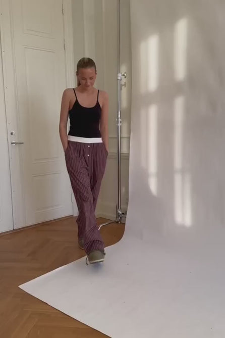 Dark brown and white striped pants with pockets on each side, a white elastic band in the waist and two buttons to give a more masculin boxer look.
