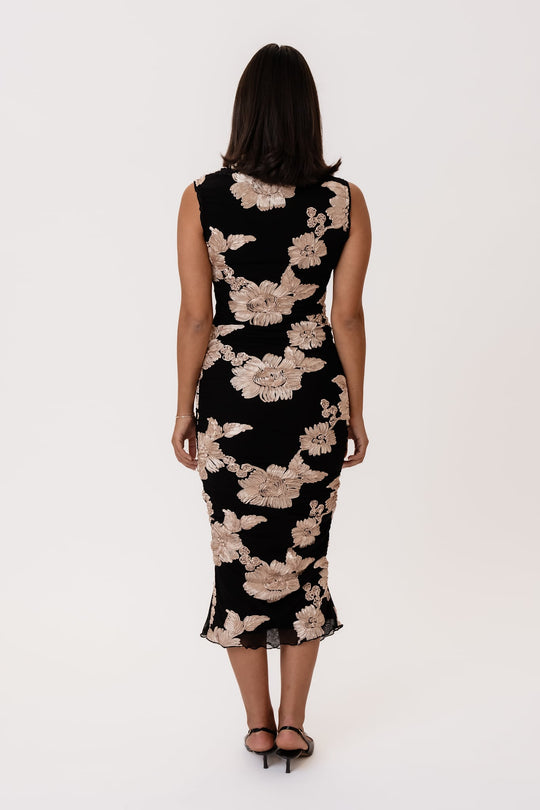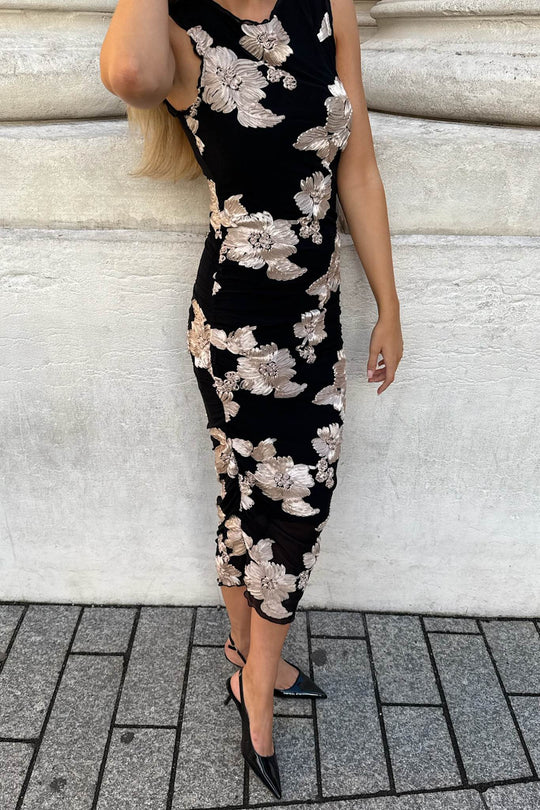 Elegant long dress in black with a form-fitting silhouette. The dress features short sleeves and a round neckline. It is adorned with beige 3D floral details throughout, adding extra character to the design. The edges of the dress have ruffle details, and the ruching on the sides allows you to adjust the length for a shorter look. The dress is made from a stretchy material.