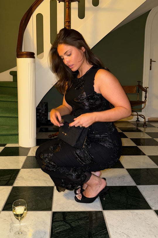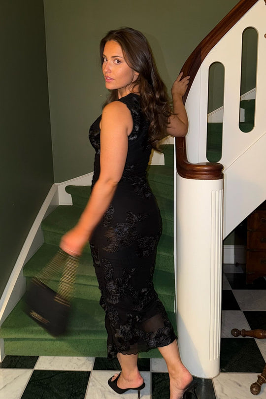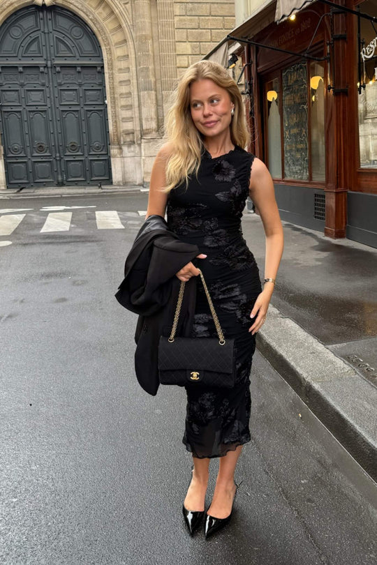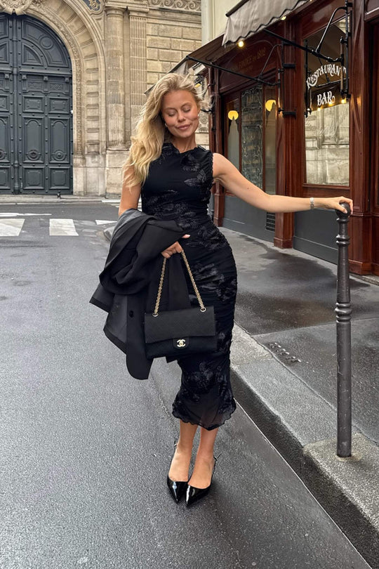 Elegant long dress in black with a form-fitting silhouette. The dress features short sleeves and a round neckline. It is adorned with 3D floral details throughout, adding extra character to the design. The edges of the dress have ruffle details, and the ruching on the sides allows you to adjust the length for a shorter look. The dress is made from a stretchy material.